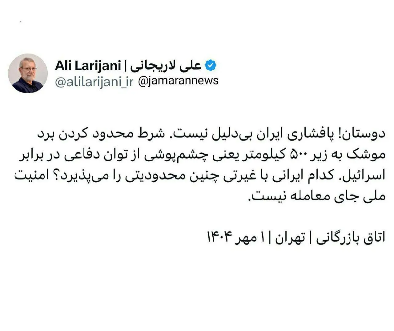 دبیر شورای عالی امنیت ملی نوشت: دوستان! پافشاری ایران بیدلیل نیست. شرط محدود کردن برد موشک به زیر ۵۰۰ کیلومتر یعنی چشمپوشی از توان دفاعی در برابر اسرائیل. کدام ایرانی با غیرتی چنین محدودیتی را میپذیرد؟ امنیت ملی جای معامله نیست.