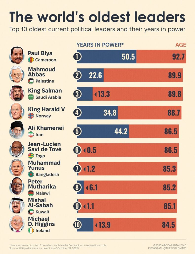 ۸ تکتم نیوز/متوسط گروه سنی رهبران حال حاضر دنیا حدود ۶۰ سال است، اما به طور حتم رهبران مسن تری هم در دنیا وجود دارد. تعداد بسیار اندکی از رهبران کشورها سی و چند ساله هستند، اما برخی از رهبران دنیا هم هستند که متولد دههی ۱۹۳۰ هستند.