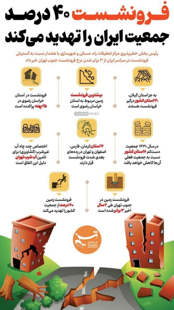 تکتم نیوز/رئیس بخش خطرپذیری مرکز تحقیقات راه، مسکن و شهرسازی با هشدار نسبت به گسترش فرونشست در سراسر ایران از ۳ برابر شدن نرخ فرونشست جنوب تهران خبر داد.